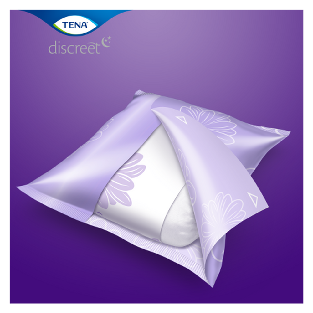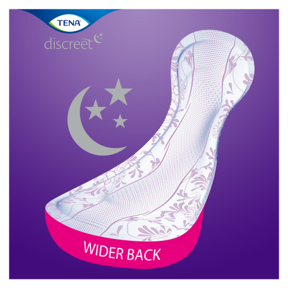 TENA Discreet Maxi Night incontinentieverband met geweldige bescherming voor vrouwen is ontworpen met een extra lange en een bredere achterkant voor superieure bescherming tijdens het slapen.