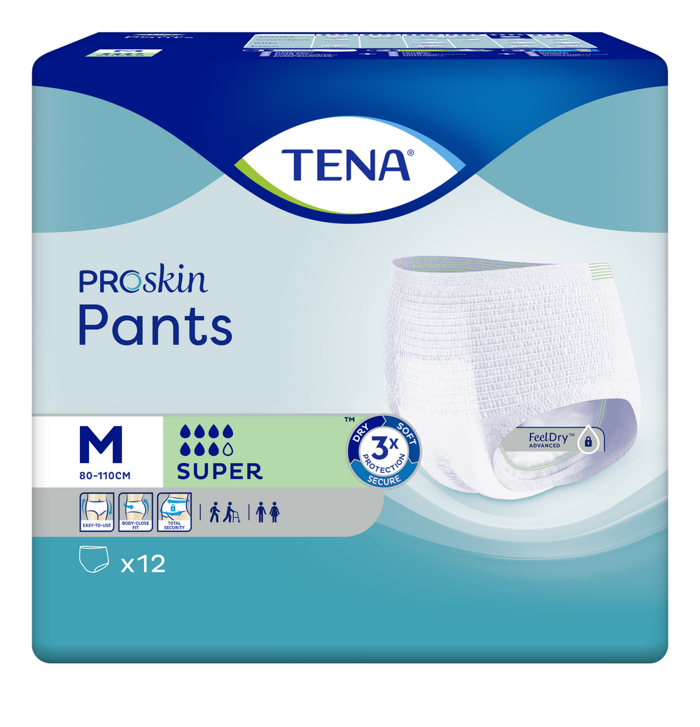 TENA Pants Super is een zacht wegwerpbroekje met een comfortabele pasvorm. Het product biedt drievoudige bescherming tegen lekken, geurtjes en een vochtig gevoel.